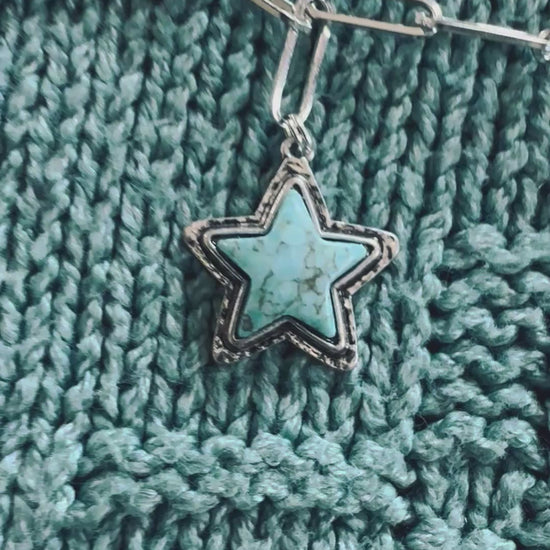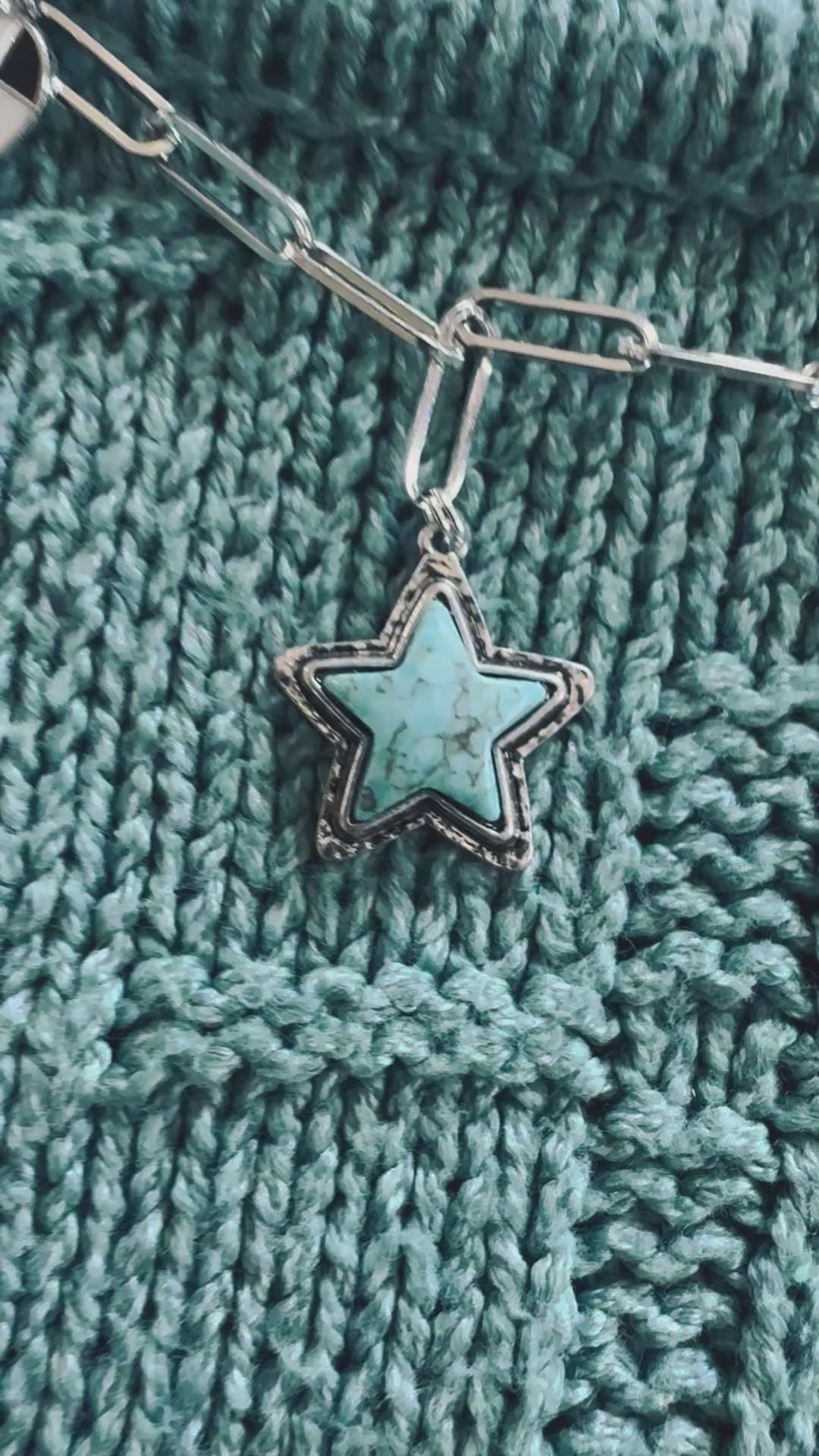 The Wild Star Necklace blends playful edge with western soul. Strung on a silver paperclip chain, this piece features a turquoise star for bold spirit, a checkered heart for a touch of whimsy, a lucky horseshoe, a classic 8-ball, and a hand of cards for a nod to adventure. Equal parts charm and statement, it’s the perfect necklace for those who love a little luck, a little fun, and a whole lot of individuality.